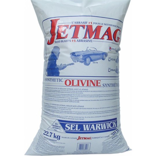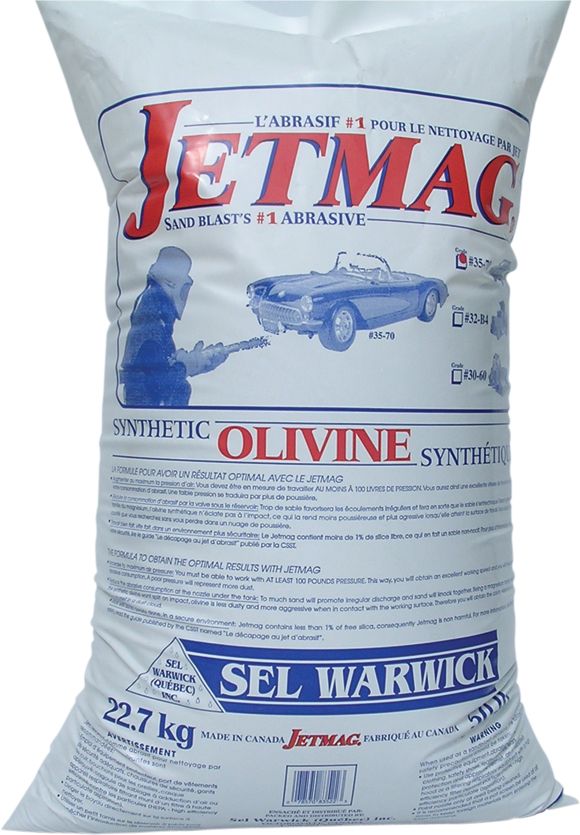 Le sable pour sablage au jet JETMAG est l'abrasif non nocif le plus performant. Le JETMAG est obtenu par la transformation de la serpentine en olivine synthétique grâce à un procédé de fusion thermique (2300°F) qui « céramise » le produit. La composition du JETMAG ainsi que ses caractéristiques uniques en font le produit le plus avantageux pour les utilisateurs de sable pour sablage au jet.